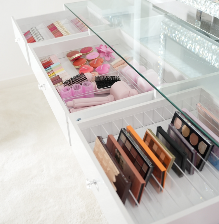 Tiroirs et compartiments pour tous vos produits de maquillage.