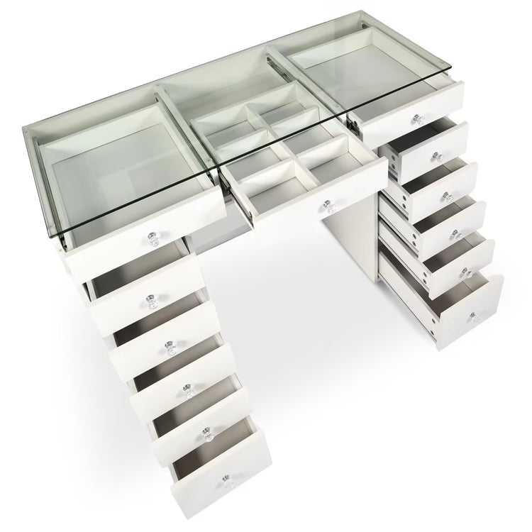 Plusieurs tiroirs profonds + options de plateaux/verre pour exposer tes favoris. Idéal pour maquillage, parfums et accessoires.
