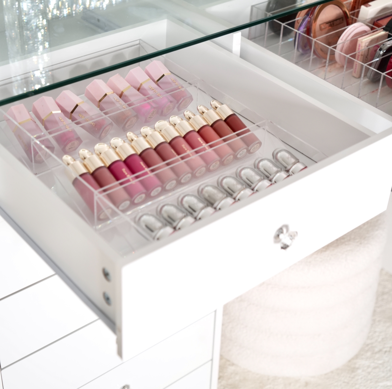 Tiroirs et compartiments pour tous vos produits de maquillage.